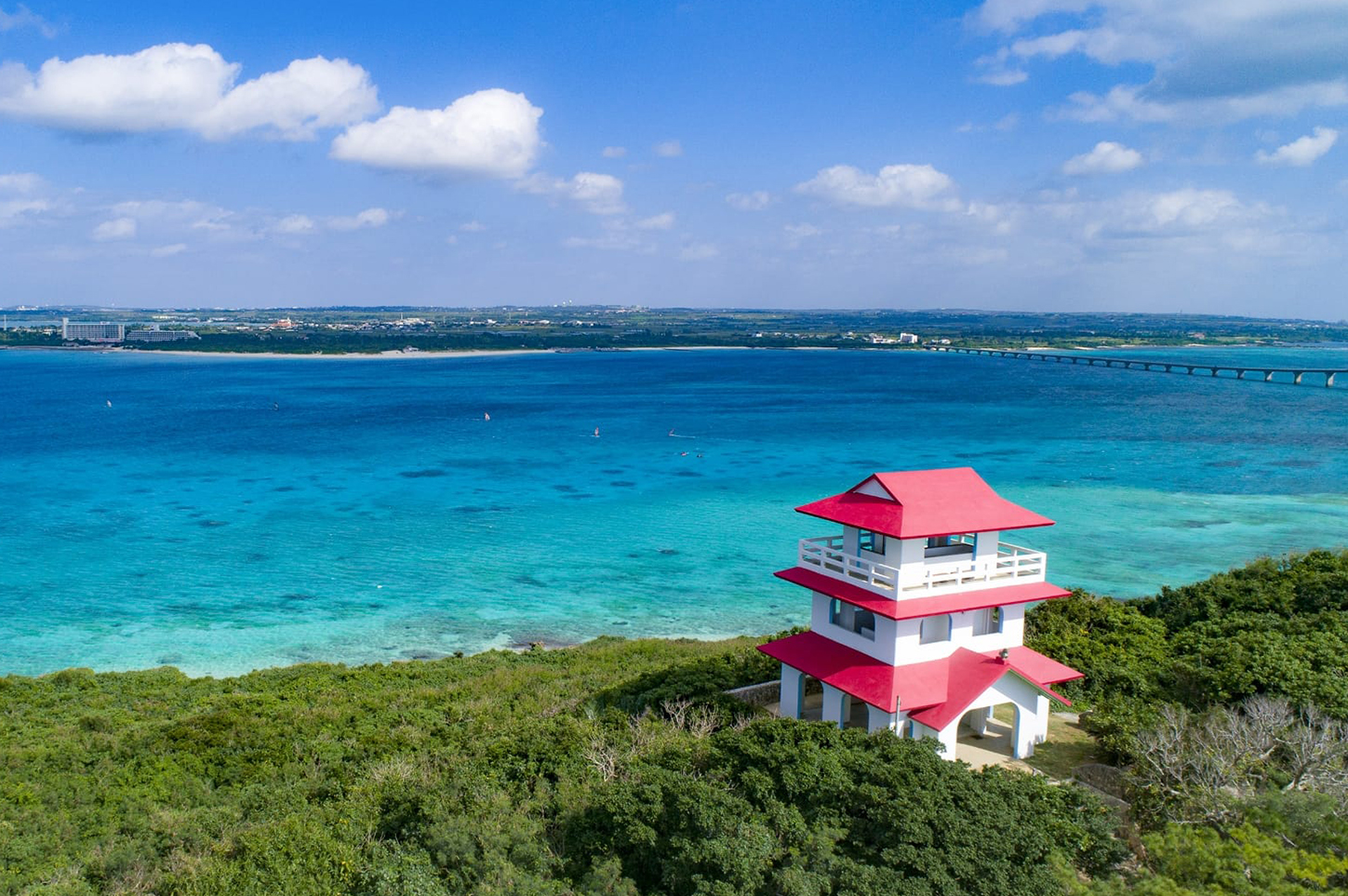 与那覇前浜ビーチの対岸に位置する来間島(くりまじま)の高台に佇む「竜宮城展望台」。まるで竜宮城のような姿の三階建てで、小窓のついた階段を上って最上階を目指します。